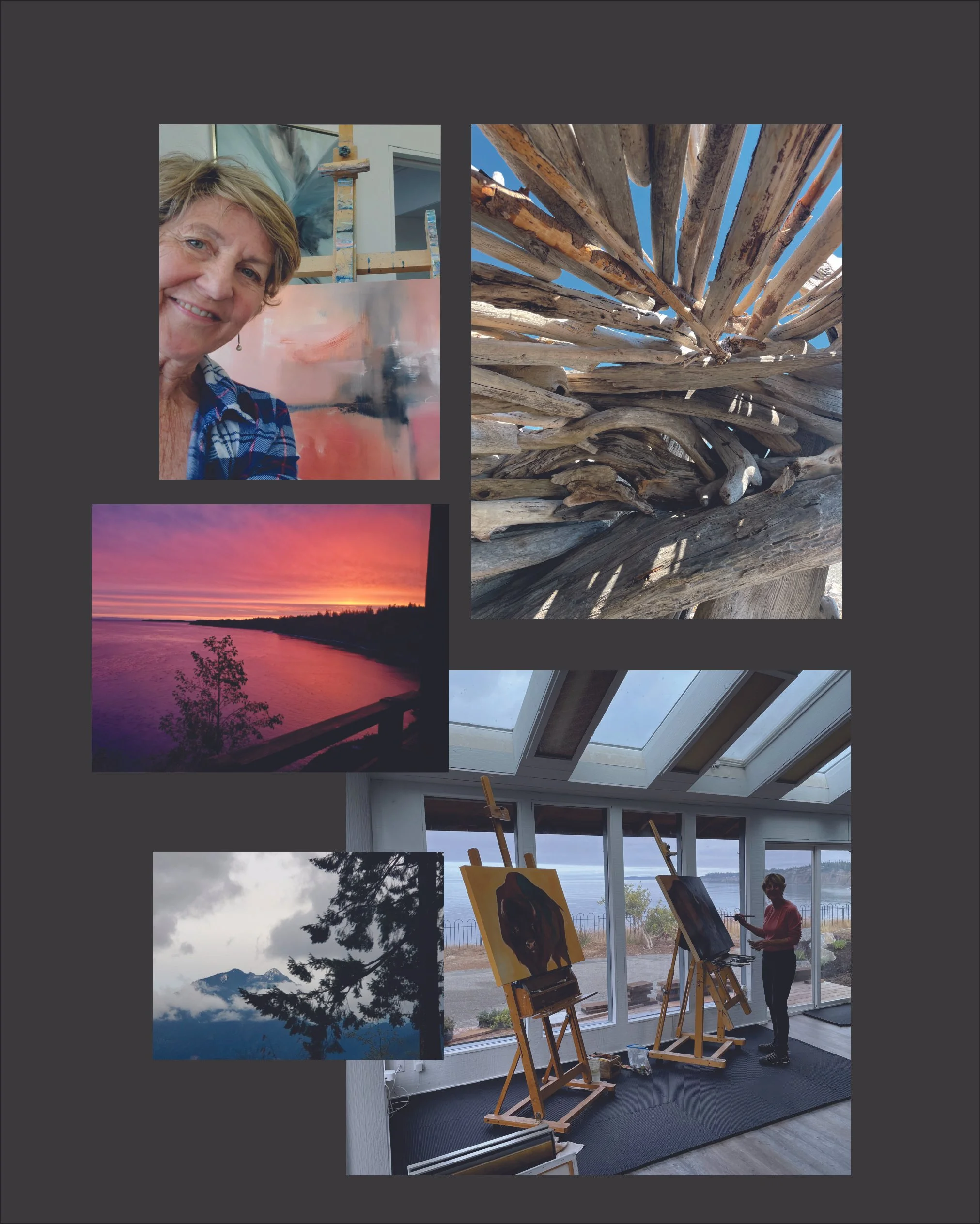 Donna lives and works on the Olympic Peninsula near Port Angeles, Washington. Overlooking the Straits of Juan de Fuca and backed up to rugged mountains she finds endless sources for creative work . The visuals and culture of the Northwest now infuse the abstract landscapes and wild inhabitants that dominate Donna’s art. Blending of figurative representation and abstraction Donna paints visual poems in which natural forms and wildlife take on more symbolic aspects .